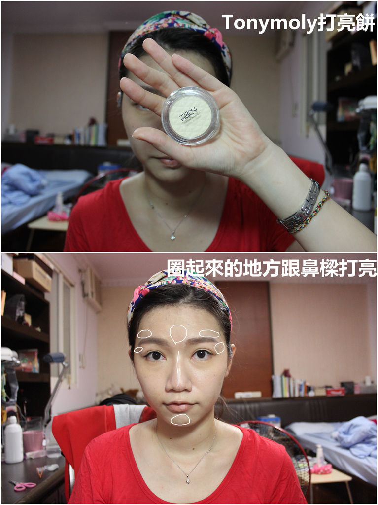 再來用TONYMOLY的打量餅把圈起來的地方跟鼻樑打亮
